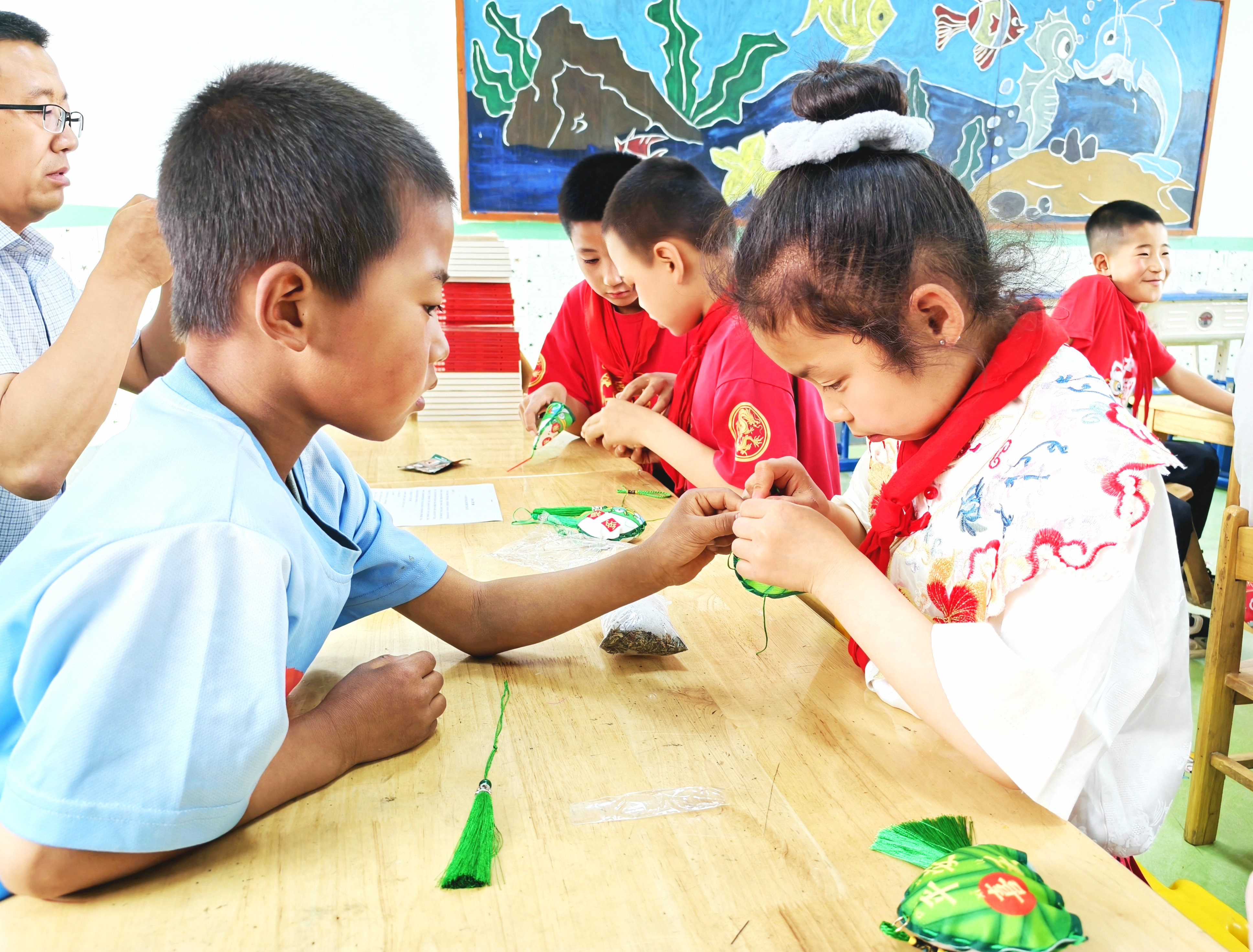 缝香囊、包粽子环节将活动推向高潮。在老师悉心指导下,两地学生线上学习缝香囊、包粽子的技巧。尽管隔着屏幕,但孩子们的热情丝毫不减。牵彩绳、装香料、缝香囊,折粽叶、装糯米、扎粽绳……孩子们学得有模有样,不一会儿,色彩丰富的香囊和形态各异的粽子摆满了桌面。大家边动手操作,边分享端午习俗,欢声笑语回荡在“云端”。