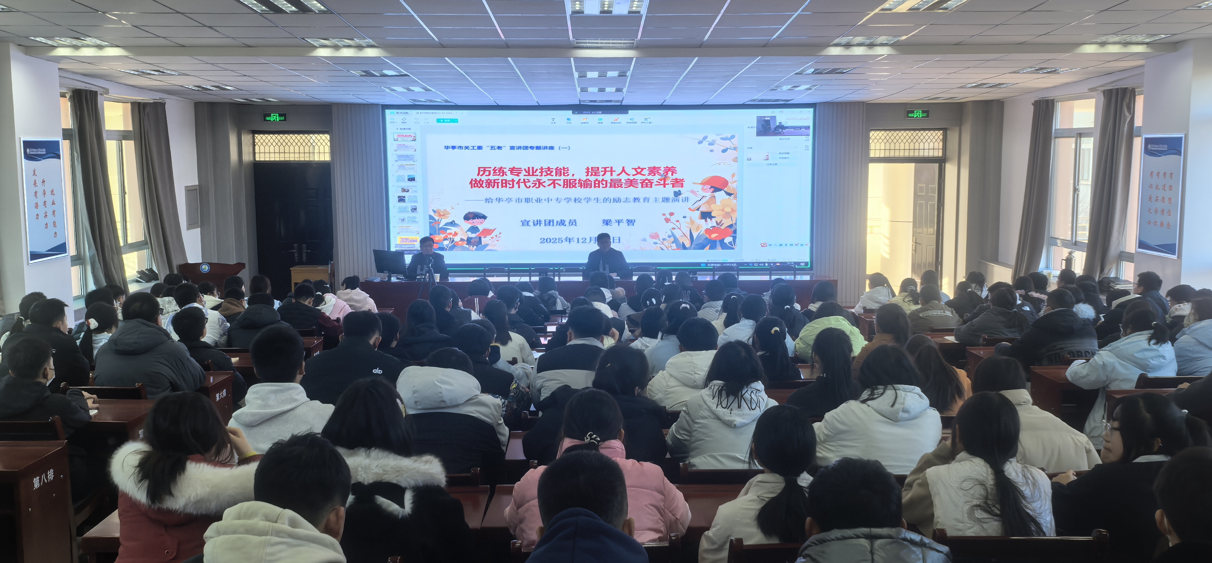 为深入贯彻落实习近平总书记关于关心下一代工作的重要论述精神,充分发挥“五老”队伍在青少年思想道德教育中的独特优势,扣好青少年人生“第一粒扣子”,12月15日,市人大常委会原副主任、市关工委常务副主任刘天义带领“五老”宣讲团成员,满怀对青少年的殷切期望走进华亭职中,为200余名师生带来了一场兼具思想深度与情感温度的青春励志宣讲。