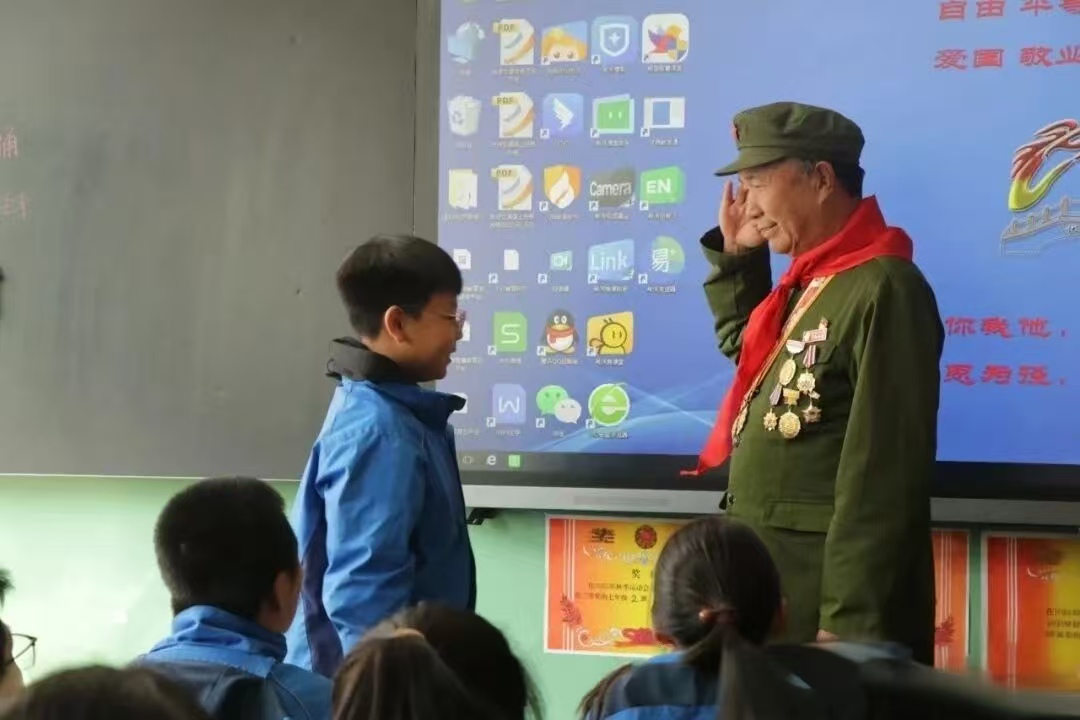 活动现场气氛庄重热烈,少先队员代表为老兵前辈、现役军人及现场嘉宾敬献红领巾,优秀团员青年献上鲜花,以少年特有的方式表达对英雄的崇敬与礼赞。参战老兵、一等战功英雄模范卢向虎结合自身亲身战斗经历,深情讲述战场上的峥嵘岁月与战斗故事,用朴实的语言、真挚的情感,诠释了军人“捍卫国家主权、坚守家国大义”的初心与担当,让师生们真切感受到革命先辈浴血奋战的铁血荣光和深沉的家国情怀。