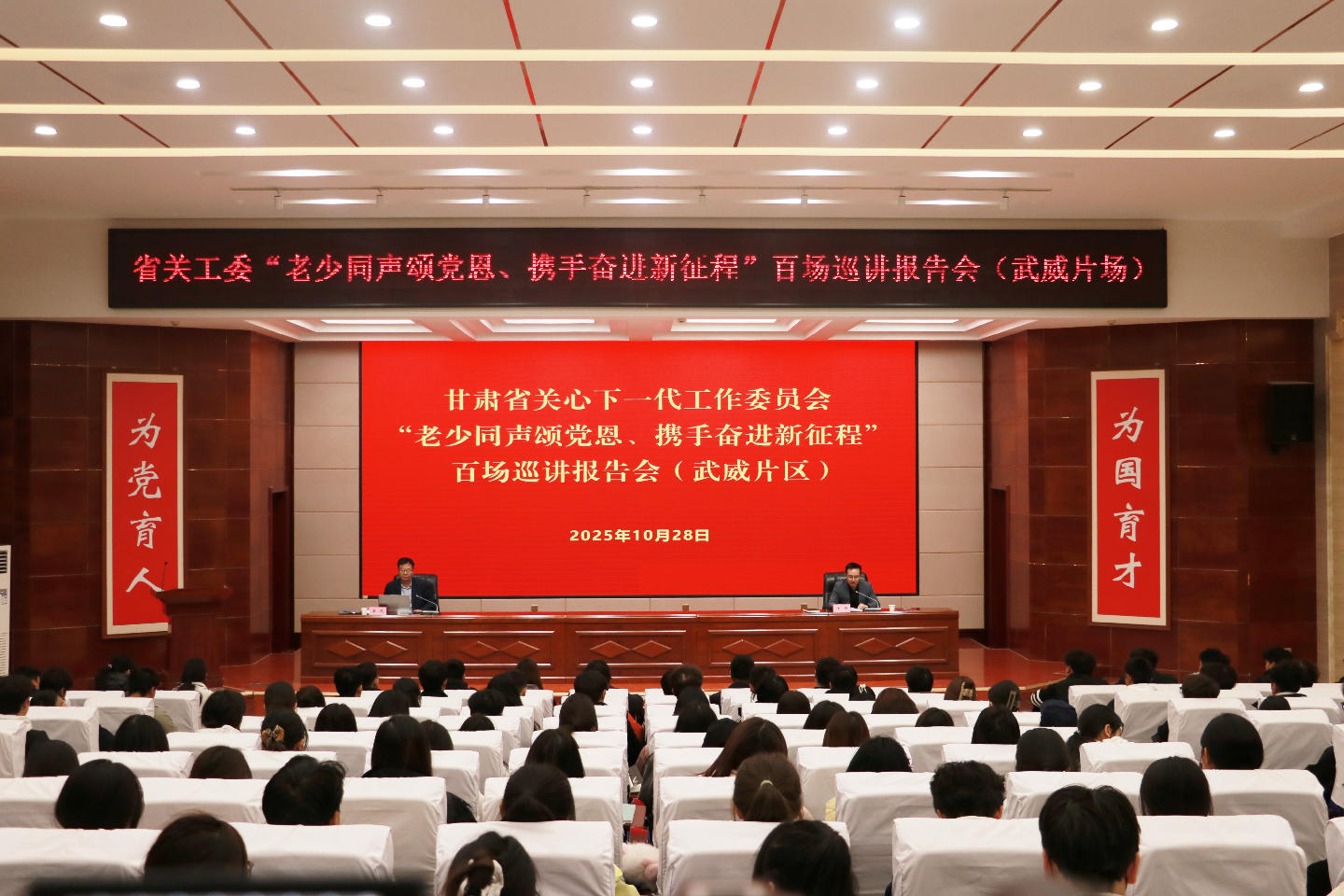 为引导广大青少年将感党恩、听党话、跟党走的信念,以及热爱祖国、建设家乡的情怀,转化为传承红色基因、赓续精神血脉的自觉行动与强大精神动力,10月26日至27日,省关工委组织“五老”宣讲报告团赴武威市开展“老少同声颂党恩 携手奋进新征程”百场巡讲活动。
